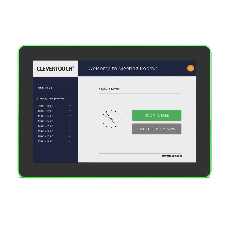 The Clevertouch Room Booking solution combines stylish 10″ interactive panels with the powerful CleverLive Rooms 2 cloud platform to streamline meeting room and classroom scheduling. Mounted outside any space, these panels clearly display room availability, upcoming bookings, and allow instant reservations via touch. LED edge lights provide visual status indicators (green = free, red = booked), helping staff and visitors locate available rooms at a glance.